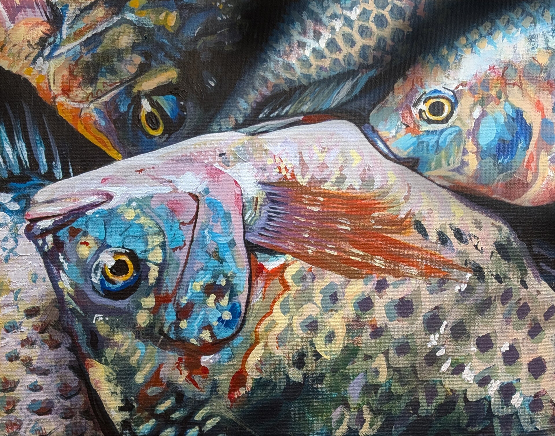 These compositions center on dense piles of fish — images that feel at once chaotic and intimate. This recurring imagery explores the tensions between beauty and discomfort, humor and unease, and an undercurrent of claustrophobia. Inspired by his culinary background, he is drawn to the raw. Many people don’t want to see “how the sausage is made”... but the transformation from a once-living thing to a plated dish reveals a grim beauty. His paintings hold that same contradiction.